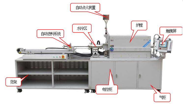 NBD-T系列高温管式炉,由自动进料系统、高温加热系统、冷却系统、真空系统、自动控制系统、四路进气系统组成。