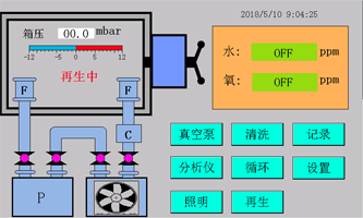 | 控制系统 1. 循 环:启、停循环净化系统; 2. 真 空 泵:启、停真空泵; 3. 照 明:开、关照明灯; 4. 分 析 仪:控制水氧分析仪; 5. 清 洗:设置清洗参数详情; 6. 默 认 值:恢复系统设定默认值; 7. 报警设置:设定水氧报警提示; 8. 设置:报警设置及箱体检漏设置,中英文切换; 9. 再生:按下再生键,控制净化柱进行再生; 10. 时间设定:预设触摸屏显示时间; 11. 记录:查询系统运行记录和水氧含量记录; | |||||||||||||||||||||||||||||||||