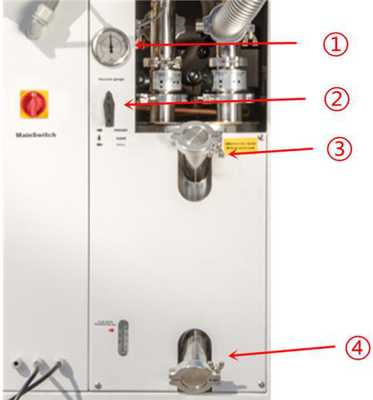 ①真空表;②三通球阀;③上料口;④出料口; 具体更换流程: 1. 关闭溶剂柱上面的两个蝶阀(10.2 里面的蝶阀②和蝶阀③); 2. 检查①(真空表),是否处于常压,如果是真空状态,通过②(三通球阀)补气到常压 3. 打开③(上料口)和④(出料口); 4. 活性炭从④(出料口)流出;清理后把④用卡箍拧紧; 5. 把干净干燥的活性炭从③(上料口)倒入;装完后,将卡箍拧紧; 6. 通过②(三通球阀)的操作,给溶剂柱抽真空、补气三次。 7. 再按照5.11.2操作,使循环气体流经溶剂柱。 | |||||||||||||||||||||||||||||||||