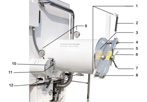 | 过渡舱结构 1. 支撑架; 2. 支撑杆; 3. 大舱盖;4. 大舱轴; 5. 大过渡舱梁; 6. 手柄; 7. 丝杆 8. 挂钩; 9. 真空压力表; 10. 小舱门; 11. 小舱门把手 12. 三通球阀; | |||||||||||||||||||||||||||||||||