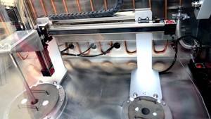 | 先抽真空,通气氛进行气体置换,然后将样品从过渡仓内送至手套箱腔体内,样品固定在电动提升电机上,送入坩埚内进行处理,通过XY轴双滑台模组将样品自动送入另一坩埚进行浸镀或淬火等试验。 | |