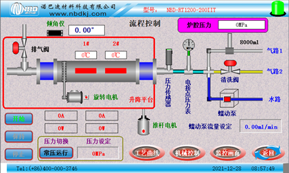 3、炉体加热系统采用2个温区进行加热,加热丝采用的是进口的铁铬铝电热丝,炉衬采用氧化铝聚晶纤维一体成型的方式,保温效果更好,热电偶采用K型热电偶,测温更加精准; 4、炉体抬升系统的设置主要是为了方便物料的加入和取出,正常烧结的时候可以让进气端稍微低些,这样可以保证物料一直在温区里面进行烧结而不会跑出温区,烧结完成后,进气端抬升到最大角度可以轻松实现物料的倒出; 5、进出气系统采用浮子流量计控制气体的流量,进出气都设置有高压的电磁阀,可以实现自动进出气,同时设置有压力传感器、电接点压力表以及机械安全阀,可以有效防止炉管超压,防止造成设备损坏; 6、自动进水系统采用的是蠕动泵进水的方式,体积小巧,操作更加方便,控制可以在屏幕上进行设置,也可以打开柜门,直接在蠕动泵上进行操作; 7、PLC控制系统集成了炉体上所有的加热以及动作的控制,所有状态都可以在屏幕上直观的显示,操作更加方便人性化; |